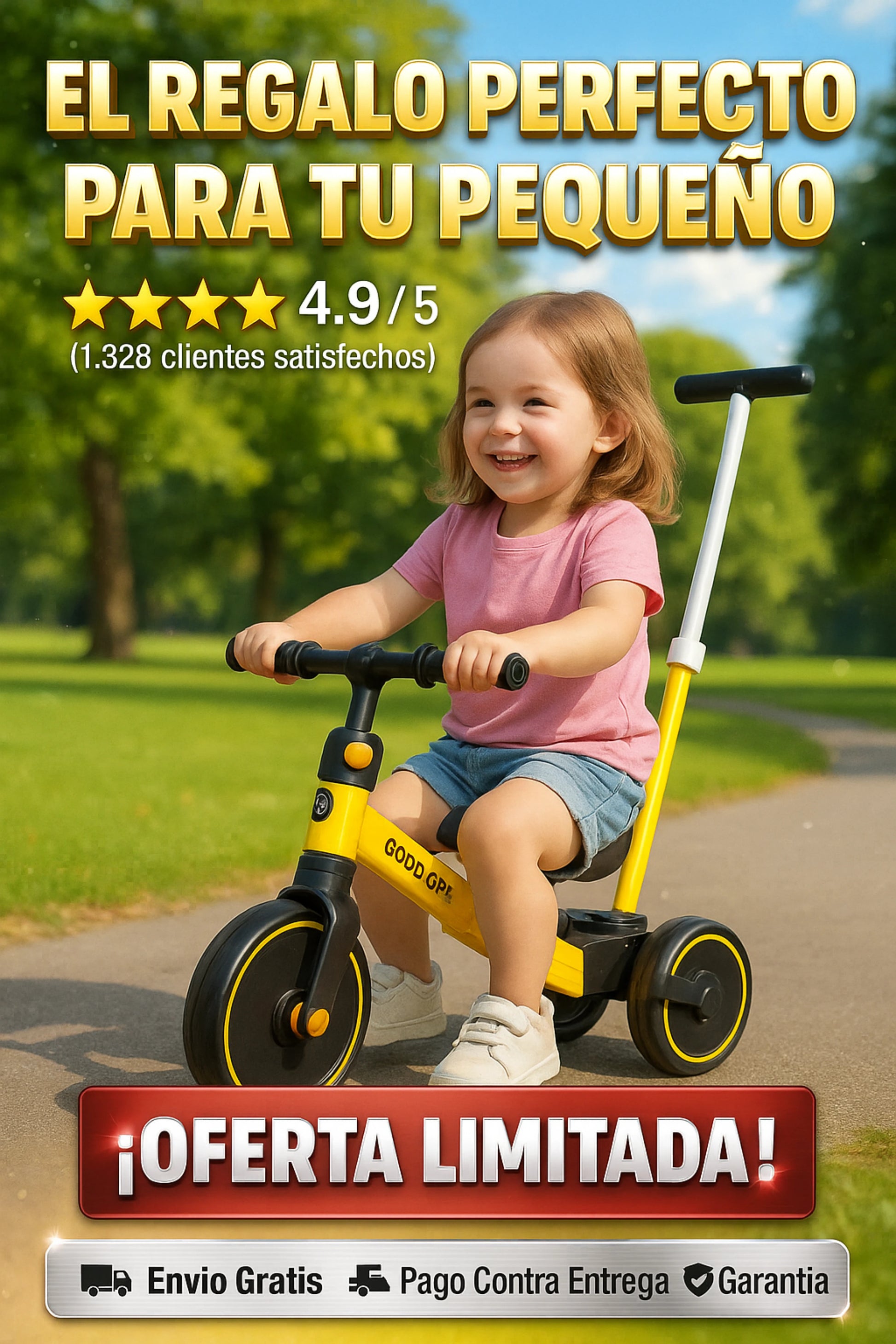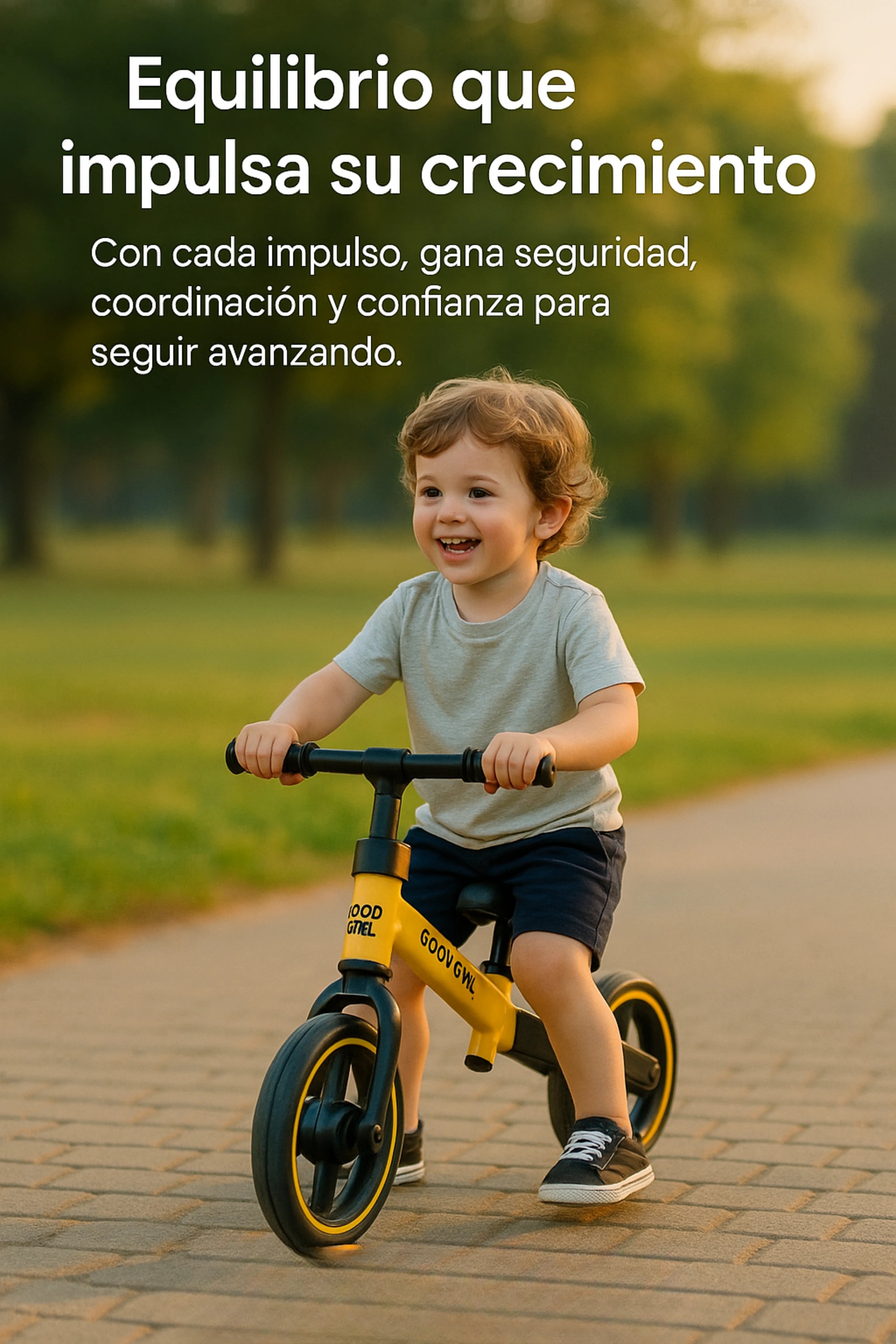 Sí ✅. Cuenta con estructura resistente, asiento ergonómico y ruedas estables que brindan equilibrio y seguridad. Además, el modo con barra de empuje permite que los padres mantengan el control total durante los primeros paseos.