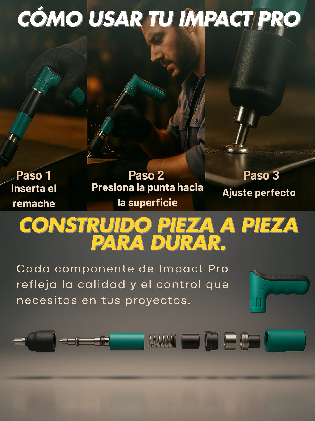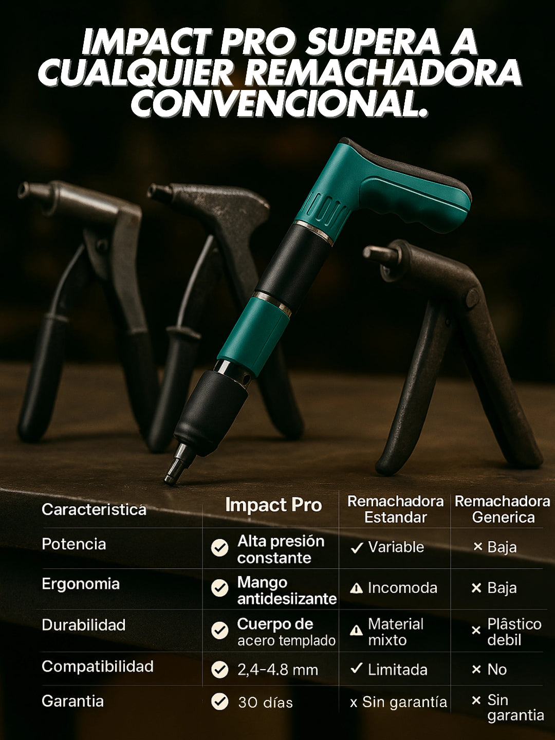 Sí. Impact Pro está diseñada para adaptarse a diferentes tipos de remaches y superficies comunes en proyectos de hogar o trabajo. Su sistema de cambio rápido permite ajustarse fácilmente al tipo de tarea que necesites.
